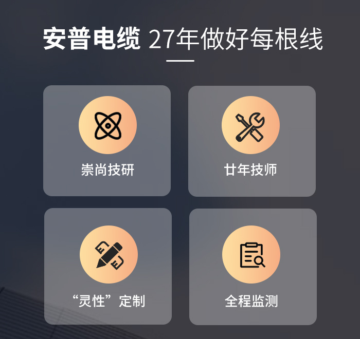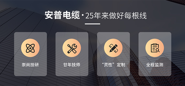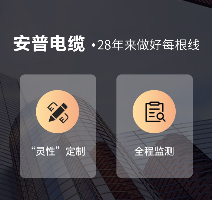 作为活跃在电缆行业高新技术领域前沿的新生代企业,安普公司自2002年创建以来,安普始终坚持以市场为导向,以“ 高起点弥补晚起步,高质量立信创品牌,高水平创造新产品”的三高原则,为打造高标准的产品,不惜巨资引进国外和国产先进设备多达50台/套,自动化生产流水线2条。产品全面覆盖10KV以下的各种橡胶绝缘电缆和塑料绝缘电缆、架空绝缘电缆、布电线;新增预分支电缆、硅橡胶高温电缆、氟塑料高温电缆、矿物绝缘耐火电缆、环保安全清洁电缆等特种电缆。